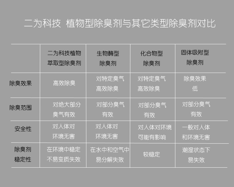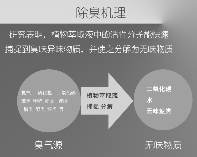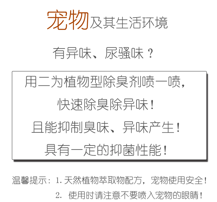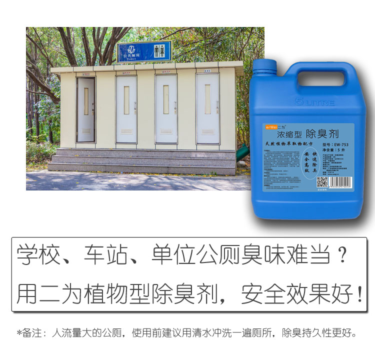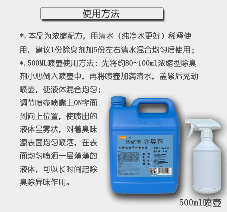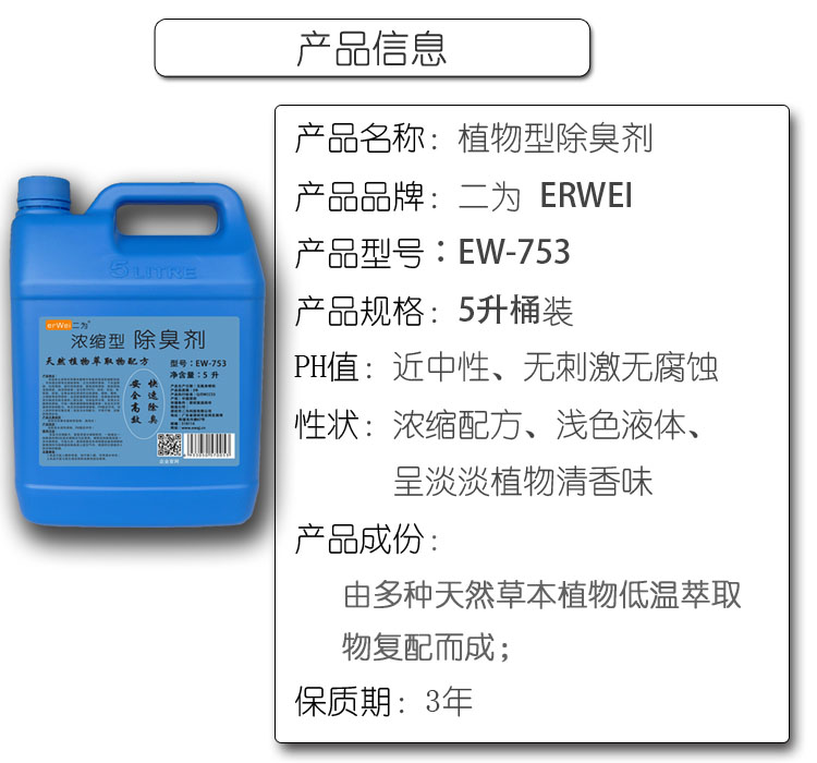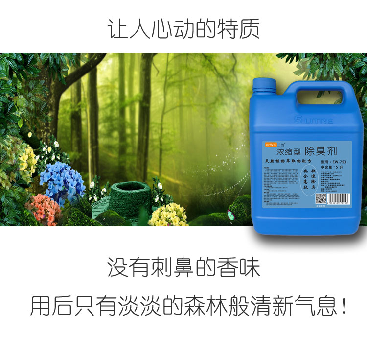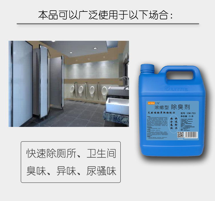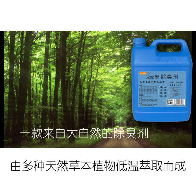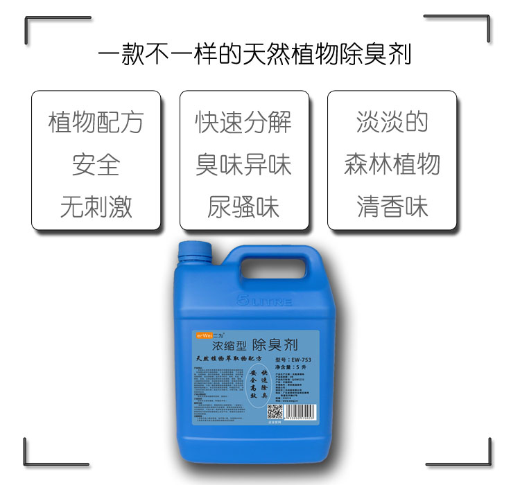 产品名称:浓缩型除臭剂 产品型号:EW-753净含量:5升产品成分:由多种天然植物萃取物复配而成产品使用方法:用五倍清水或纯水稀释后使用,装入喷壶中对有异味的地方均匀喷洒产品特点:天然植物萃取物配方,PH值呈中性、对人体和环境无毒、无刺激、无腐蚀,可以快速分解去除环境中的异味、臭味、尿骚味、霉味等。