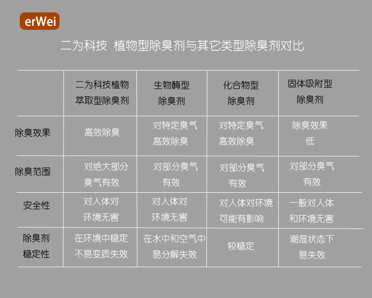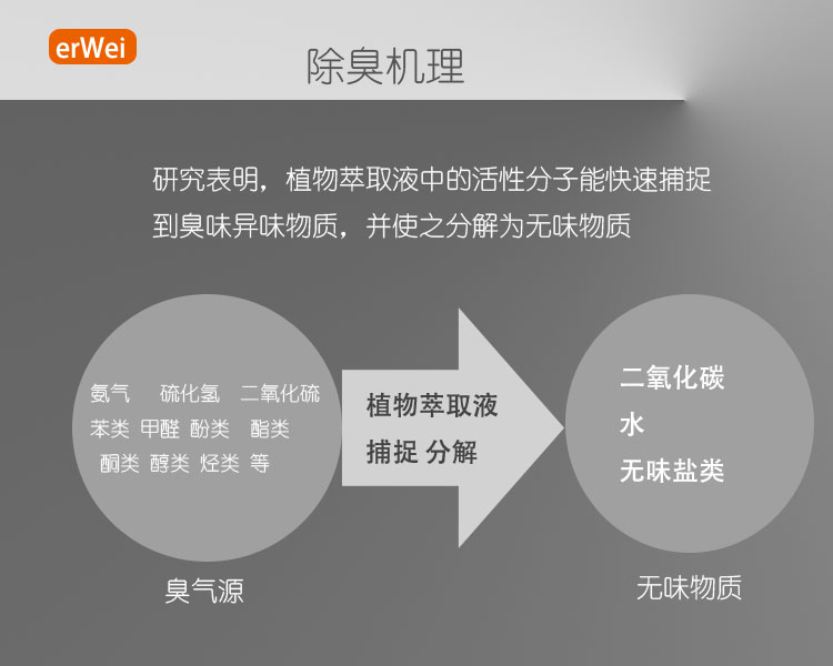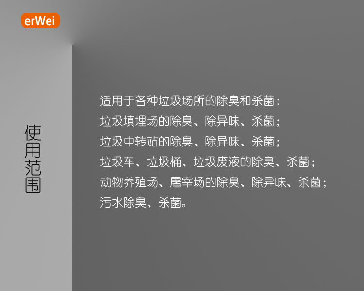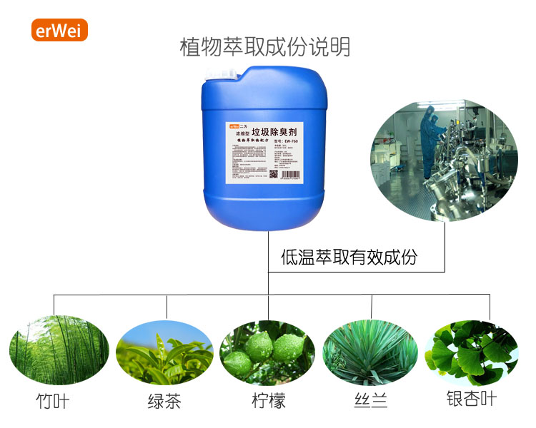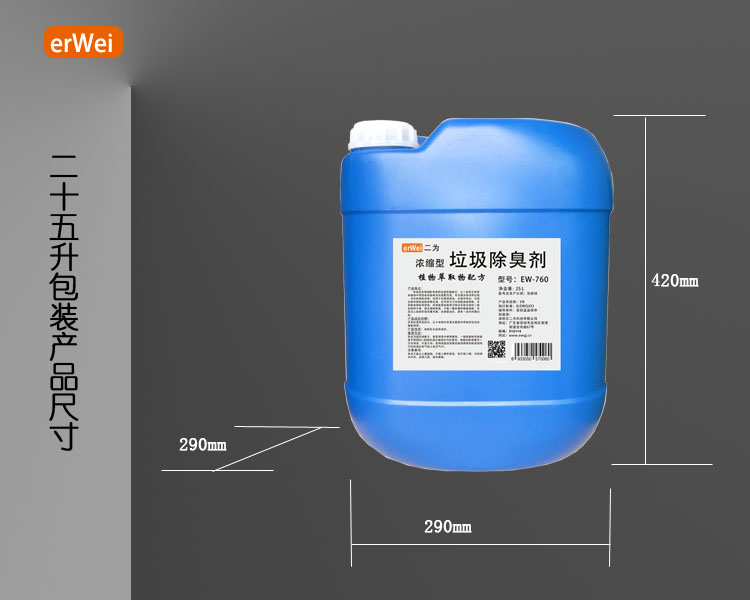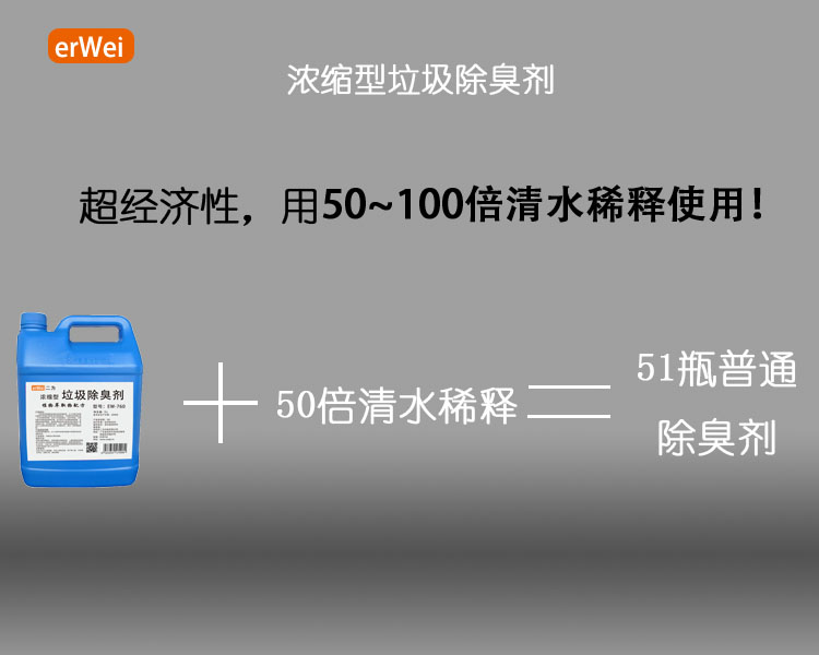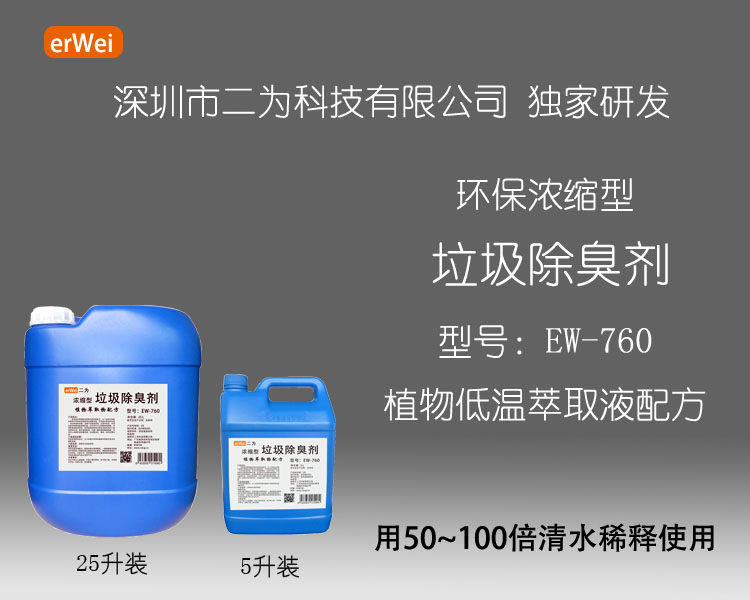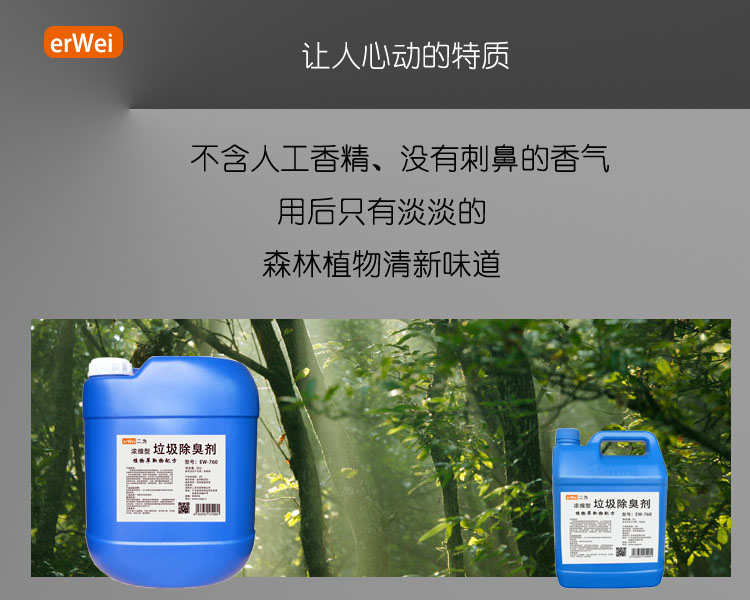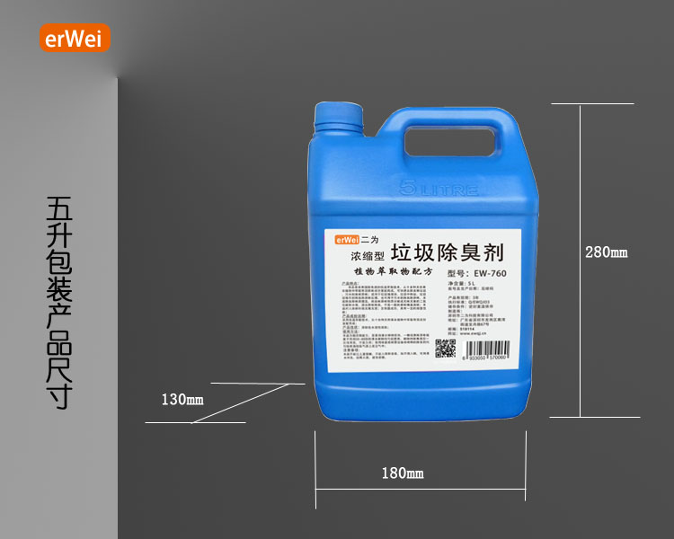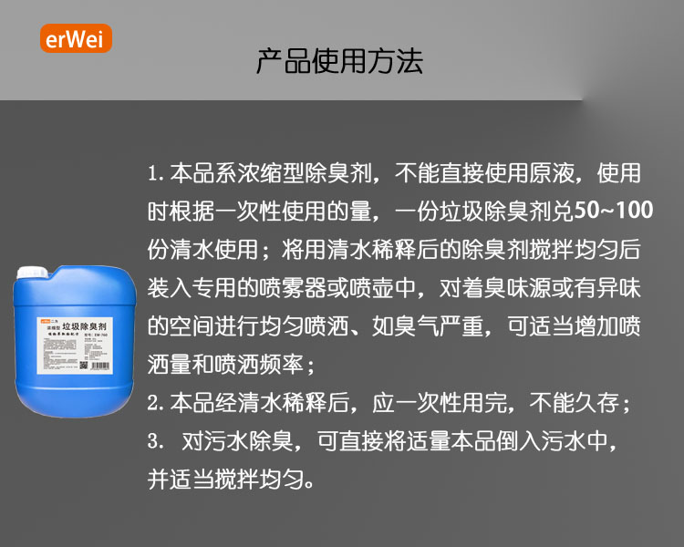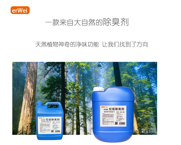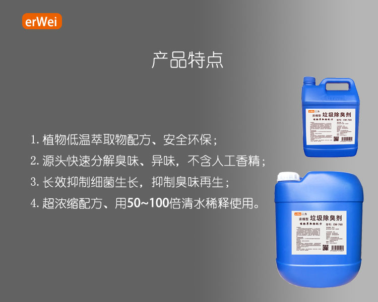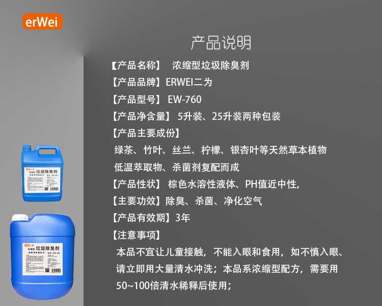 产品名称:浓缩型垃圾除臭剂产品型号:EW-760产品品牌:ERWEI产品净含量:5升产品包装:5升方型塑料桶装产品使用方法:用50~100倍清水或纯净水稀释均匀后使用,一般将稀释后的除臭剂装入喷雾器或喷壶或自动喷淋装置中,对垃圾及场所环境进行均匀喷洒;产品特点:二为科技创意产品 ,采用多种天然植物萃取物复配而成,PH呈中性,对人体和环境无毒无害无刺激,可以快速分解垃圾中异味、臭味物质为二氧化碳、水、无味盐等物质,是分解型除臭剂。